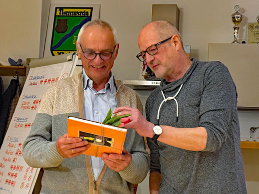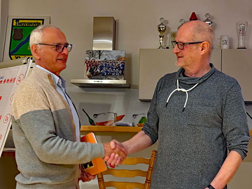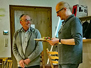 Auch unser Schreiner Mani Wüpping erhielt für die gelungene Neufassung unserer Theke/Küche zur Erinnerung ein Jahrbuch des Vereinsjahres 2025.